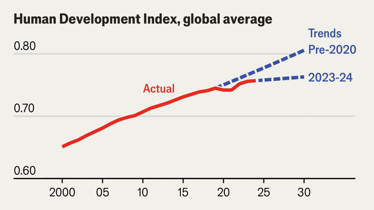 The Human Development Index — the world’s broadest measure of wellbeing — has effectively flatlined. UN data shows that HDI growth across very high‑HDI countries has slowed to 0.1–0.3% annually over the past decade. We are adding more technology, more compute, more connectivity, yet the lived experience of development is stagnating for most people around the world.